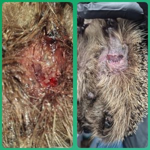 The second singleton hoglet of the day, this one is a 71g female and was absolutely covered in flystrike. She had just hatched maggots in her ears and mouth and