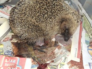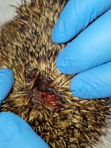 This elderly male hedgehog weighing 501g was brought in from Carey last night. He is in very poor condition, emaciated, dehydrated and has several bite wounds. He also had flystrike