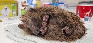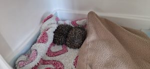 These two female hoglets, weighing 90g and 106g, came in late yesterday afternoon. Sadly a dog dug out a nesting mum and her hoglets. Mum took off and two hoglets