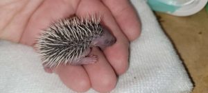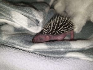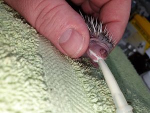 This tiny 20g hoglet came in at 11 o’clock tonight, so 2 hourly feeds it is… It is approximately 36 hours old as it has all its white spines but