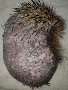 Please do not ever try to ‘have a go’ at looking after sick or injured hogs yourself. This female hog came to us this morning, having been found last October