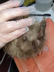 This 872g adult male hog came in this morning after being found laying out in the finders garden. He was quite cold and lethargic. On examination it was evident he