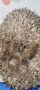Another sad case, 449g male hog came in after being seen dragging a back leg. On examination it was found that the right hind leg was missing (old wound, totally