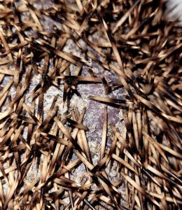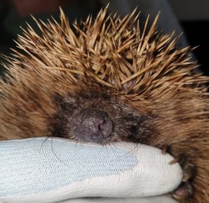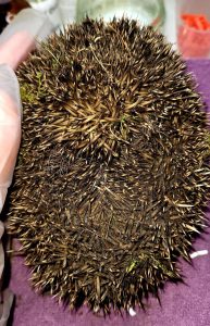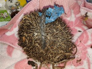 This hog came in to us this evening after being dug out of its nest by a dog. It was covered in strips of plastic and carrier bags, a sad