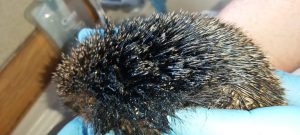 This little hog came to us covered in tar yesterday. He was cleaned up with Fairy Liquid and a tooth brush. We managed to get most of the tar off,