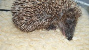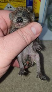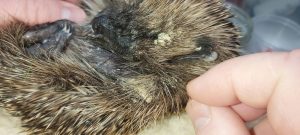 This 358g juvenile female hog was brought in to us last night, freezing cold, soaking wet and covered in flystrike (Myiasis). She was given warm subcutaneous fluids and placed on
