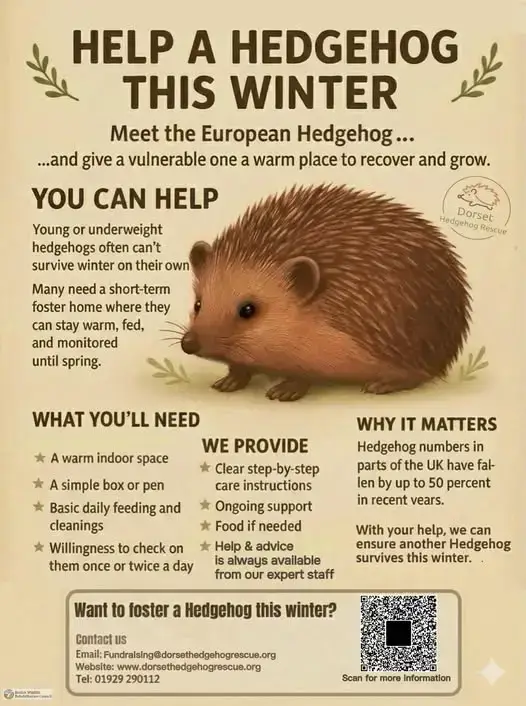 Can you help? Do you live within 15 miles of the rescue centre and are able to give a hedgehog a safe and warm home for the winter?? If so please register your details https://dorsethedgehogrescue.org/foster-care-form/