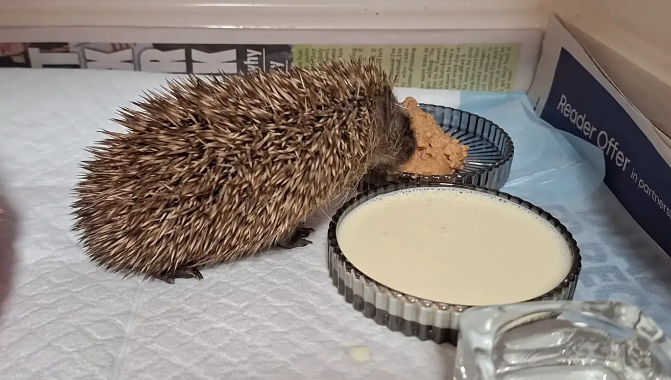 A hungry little hoglet smashing into puppy mousse shortly after arrival at the rescue