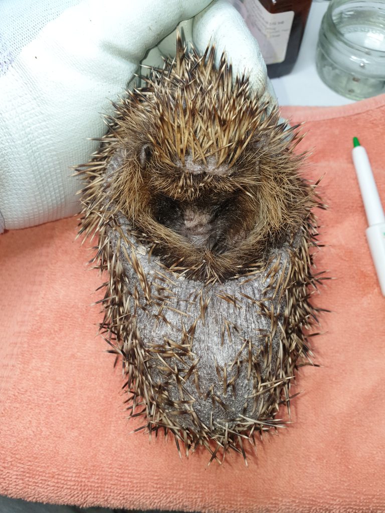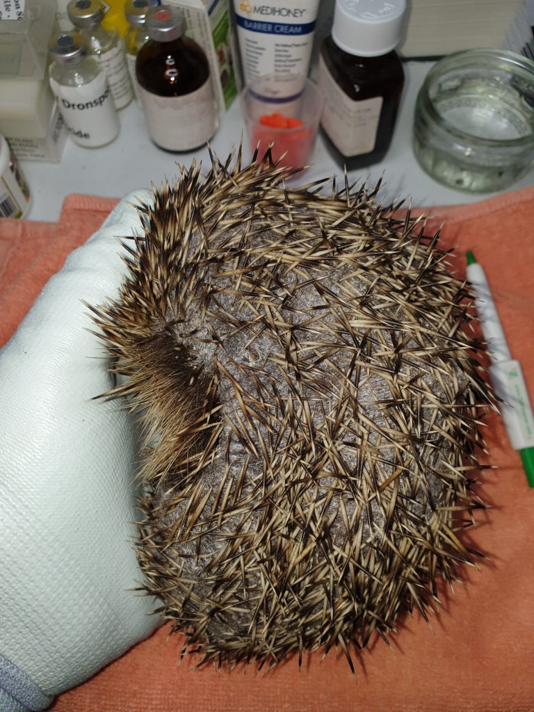 As you can see, she is in terrible condition. No poo samples had been checked and she has lost 50% of her prickles due to a fungal skin infection. She is emaciated due to having a heavy internal parasite infestation, including lungworm – none of which she has been treated for.