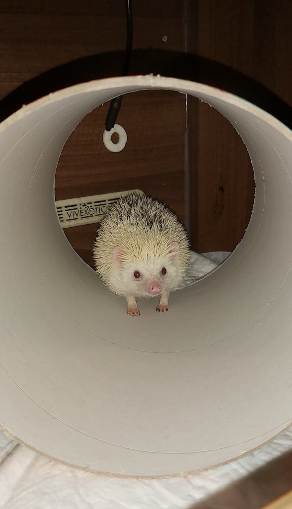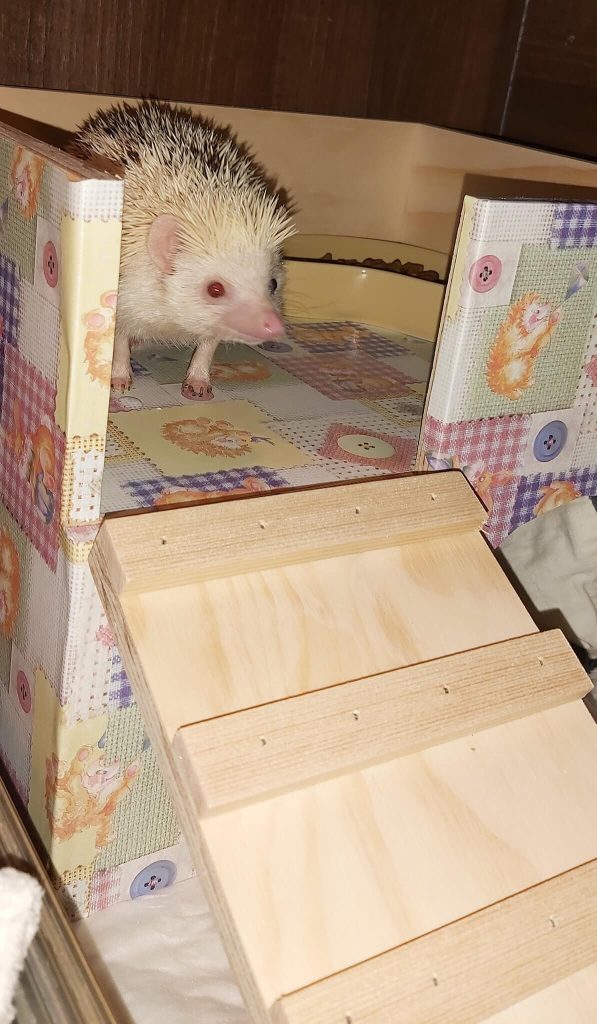 Since joining us she has settled in nicely and is quite the Diva. Here she is exploring her new hide, with a feeding area on top and sleep area below. Despite only having three legs, she can manage the ramp and her running wheel very well. She also loves to play hide and seek in her cardboard tunnel.