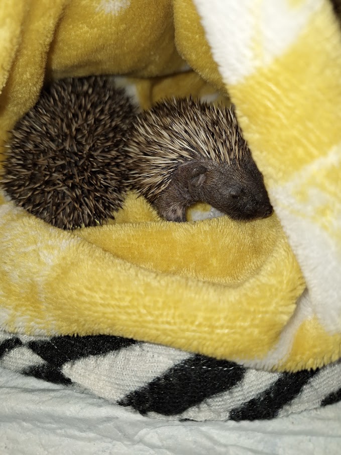 They are both doing well and Poppet’s eyes have opened today. We expect Henny’s will open within the next day or two. Hoglets generally do better when they have another hoglets to snuggle with, and these girls are no exception. Their feeding patterns are polar opposites. Poppet is a slow methodical feeder. Henny gulps her formula down as if she is half starved, despite being fed every 4 hours since she arrived. Hopefully she will slow down a bit once she knows food is readily available. Her belly was completely empty when she arrived, so she may have been without her mother for quite some time, hence her haste to feed.