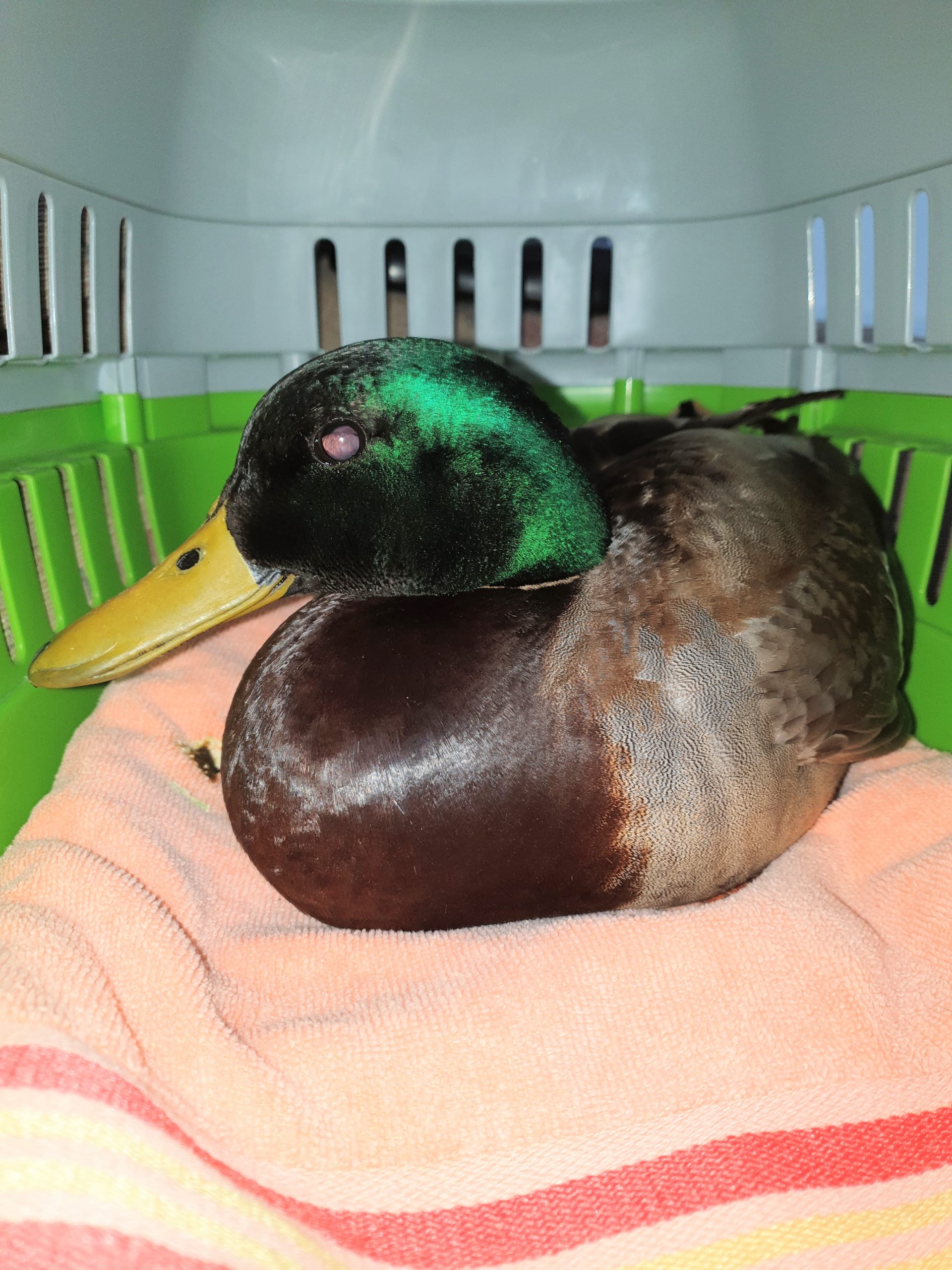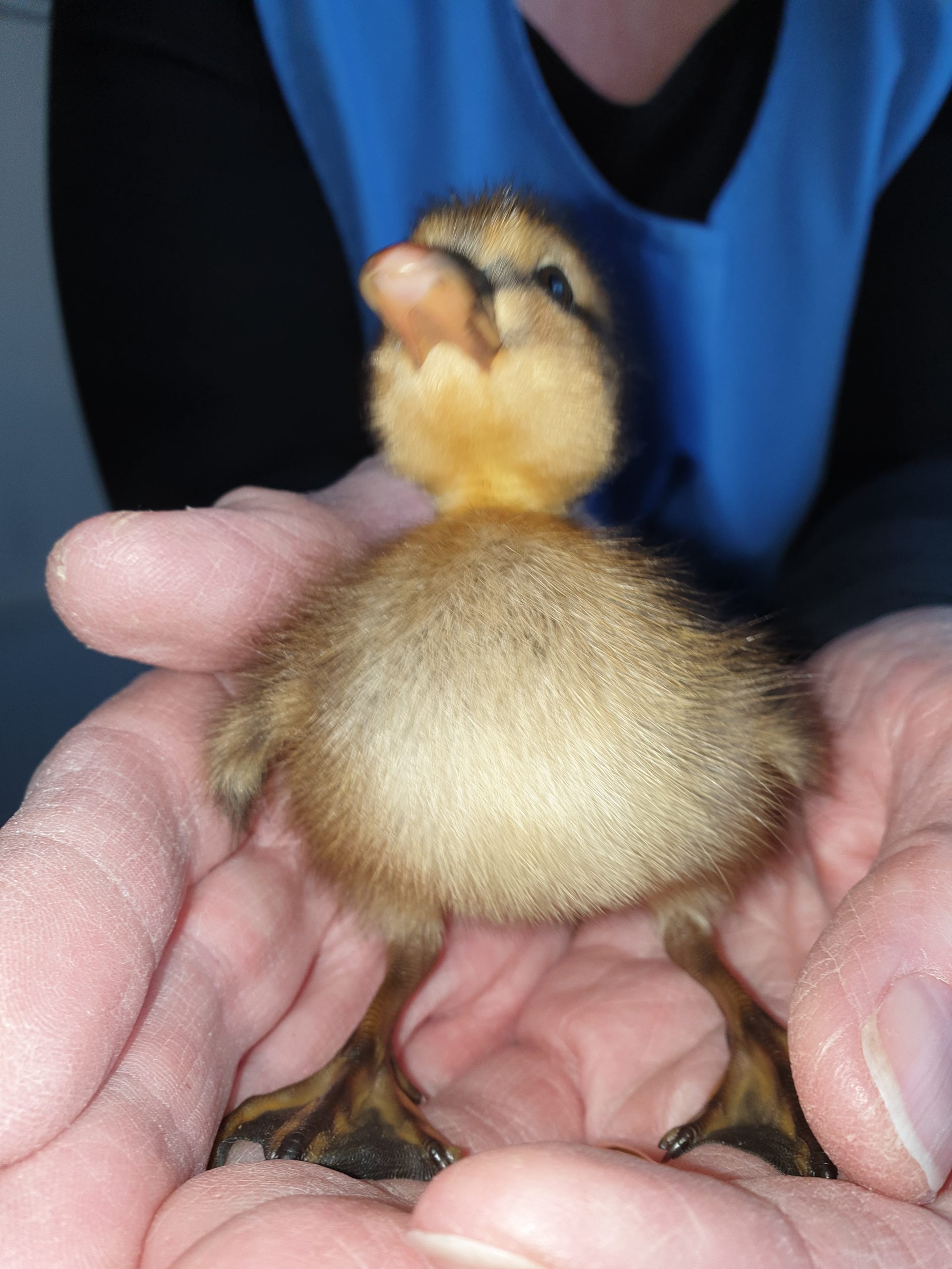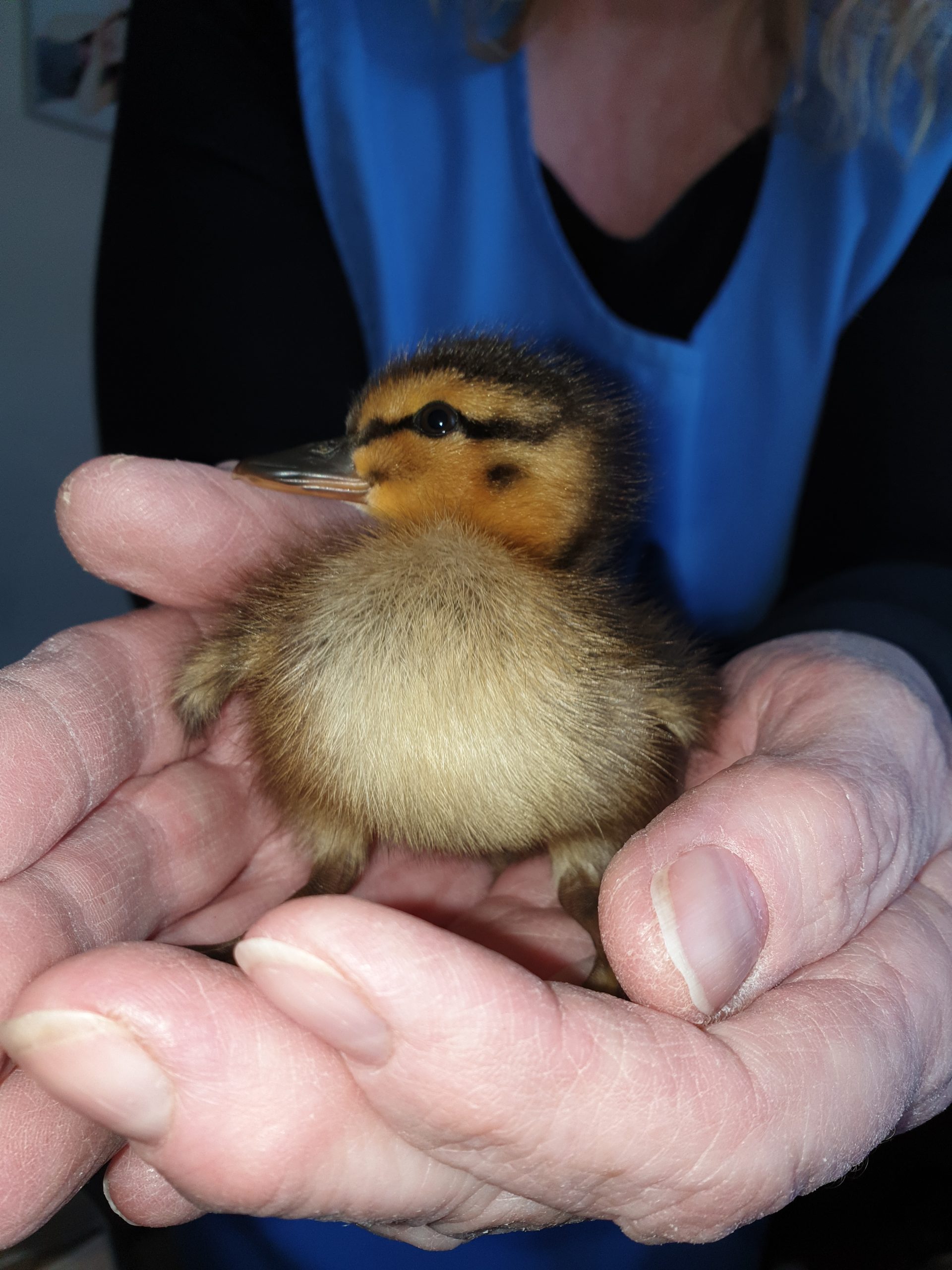 Tracy wasted no time in holding the fluffy ducklings. Sadly mum had been killed. We don’t know if the Drake is dad or not, but he came with the ducklings. He appears to have a problem with his left eye.