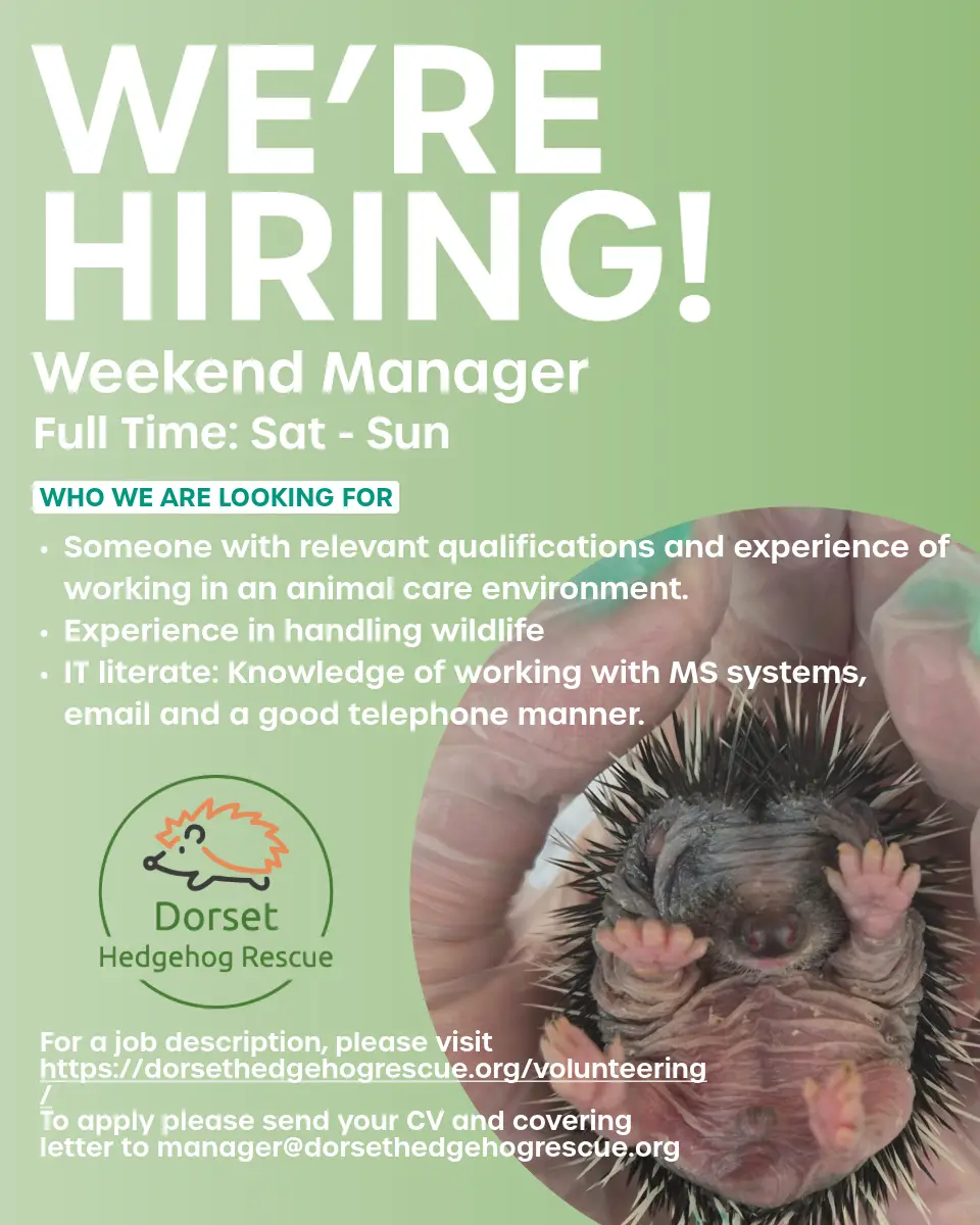 We now have an exciting opportunity to join our team at Dorset Hedgehog Rescue as a weekend manager!