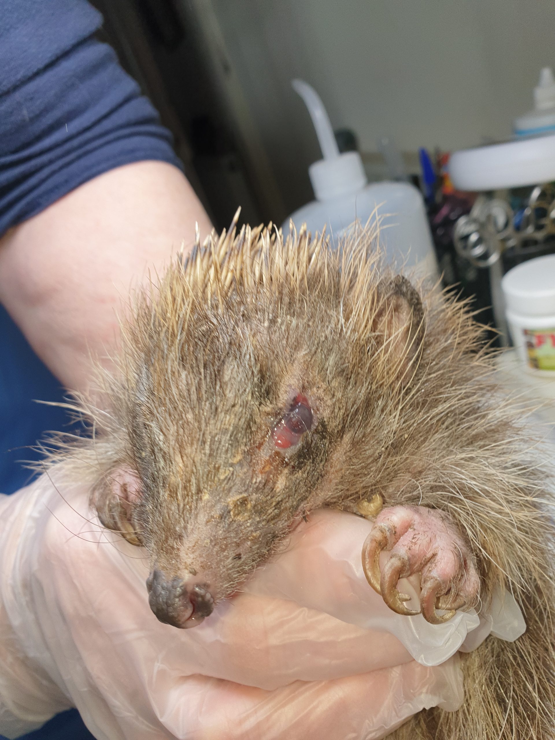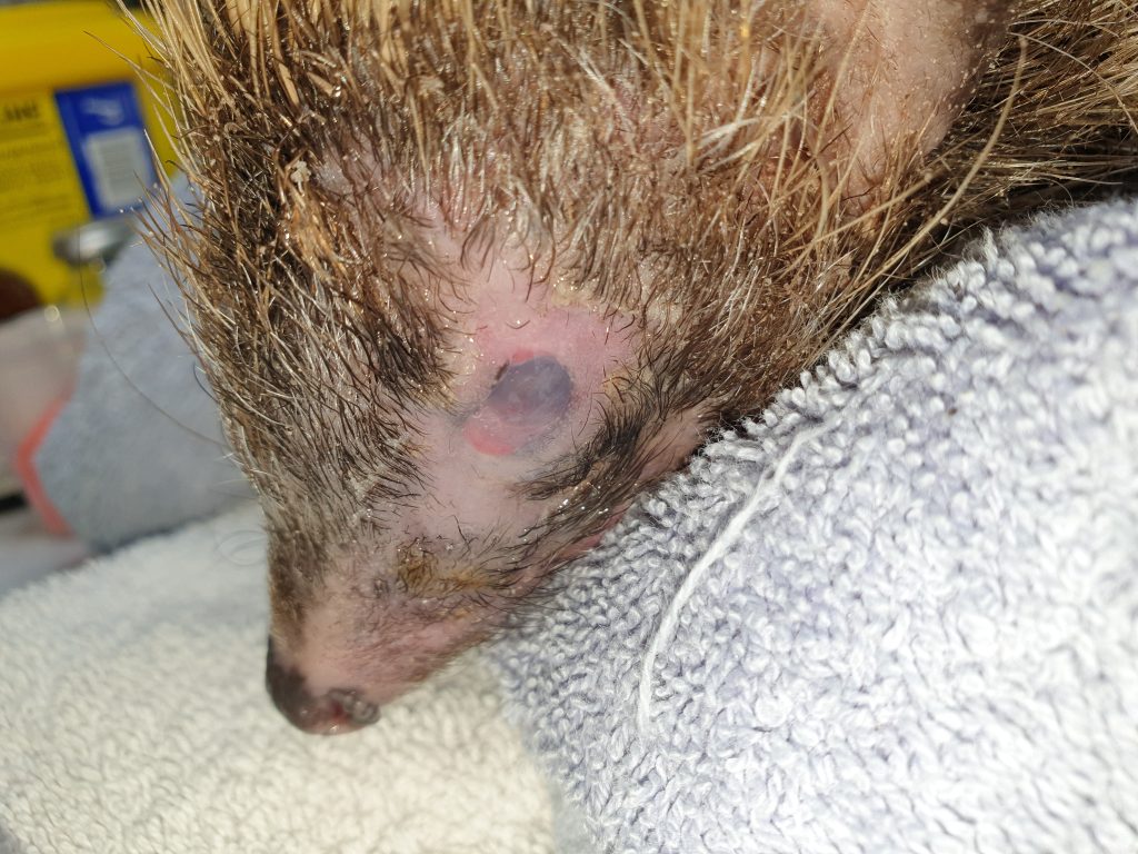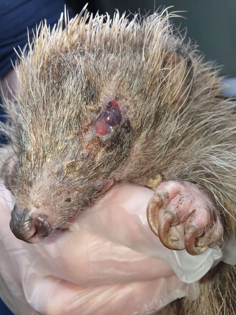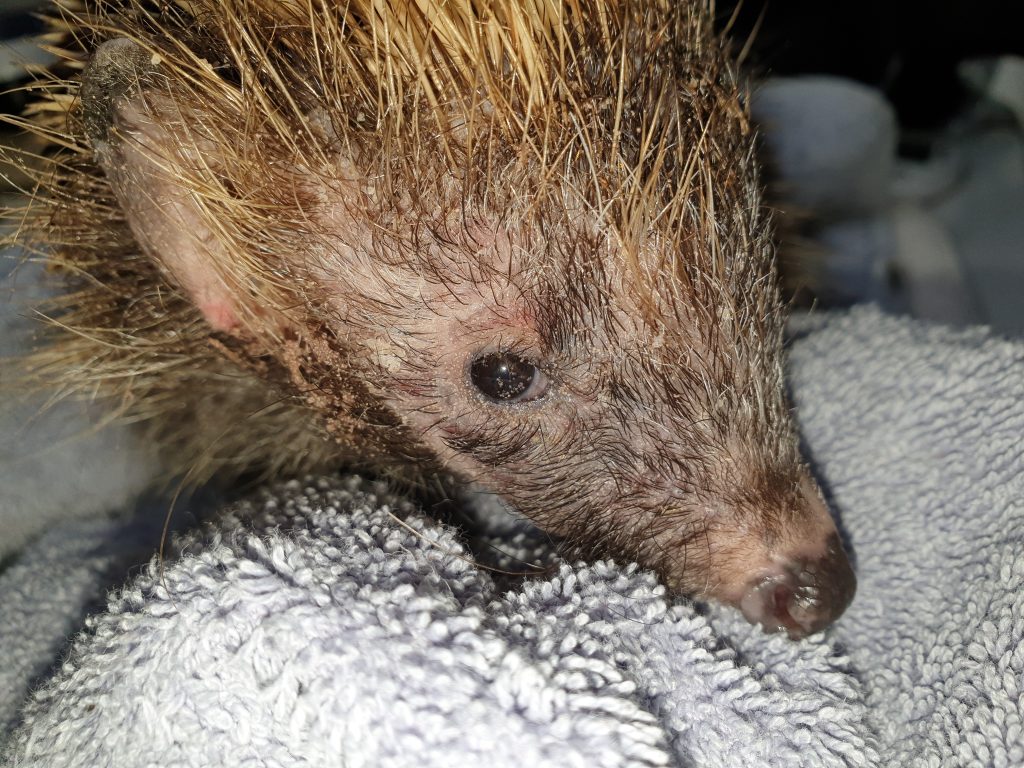 Another very poorly hog in this afternoon after being found out during daytime. This elderly female hog, weighing 824g, has a huge mite infestation, is very lethargic and despite her weight looks emaciated with lots of loose skin. She also has a nasty injury to her left eye, which is possibly from trying to scratch away the mites with her over long claws.