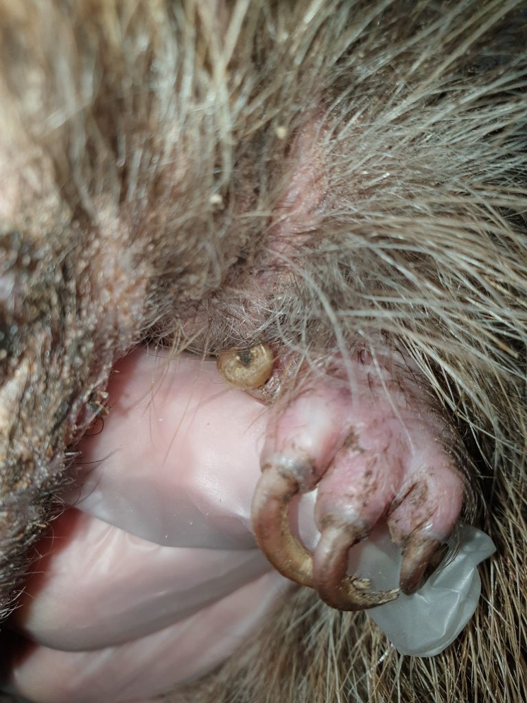 We strongly suspect that this hog has been kept in captivity as she shows no signs of being scared of humans, and her claws are massively overlong and curled around – these would have worn down naturally in the wild, which leads us to believe she has been kept in a hutch or cage.