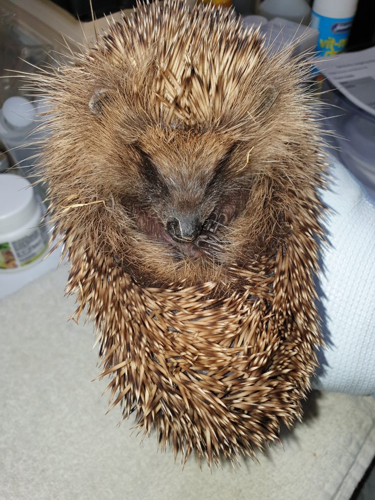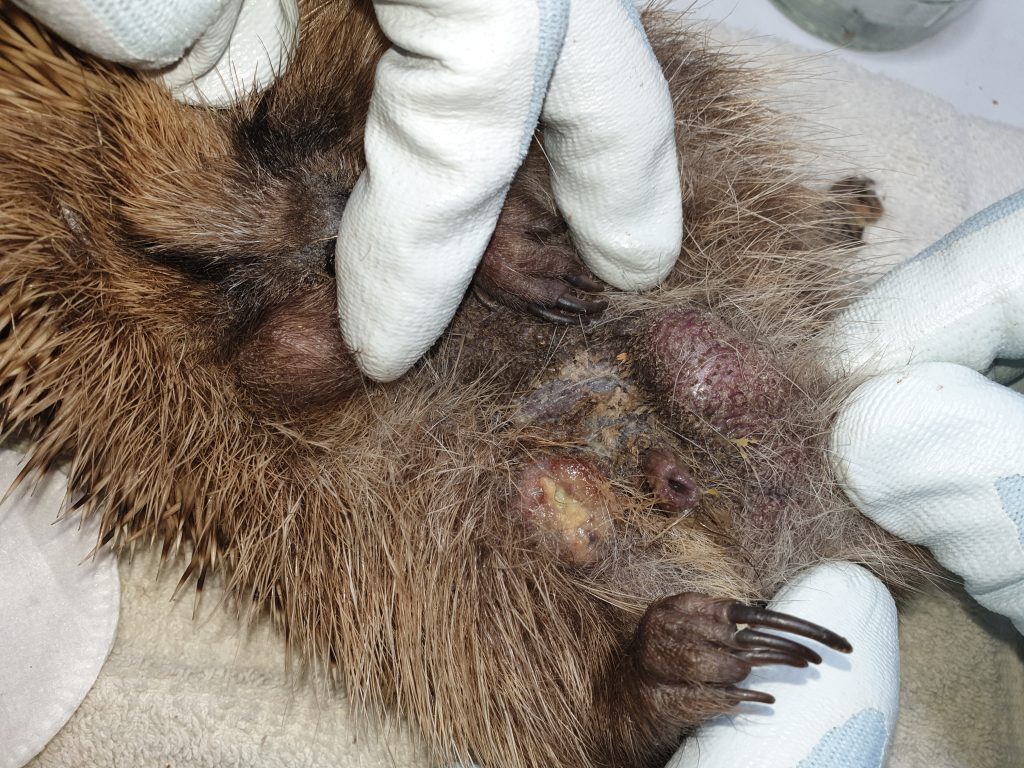 This poor chap is another hog that has come out of hibernation in very poor condition. He was found out in daylight looking for food. As you can see in the photos, he is very emaciated and dehydrated, he also has a nasty, infected skin condition on his underside.